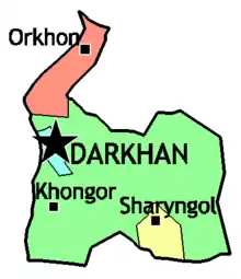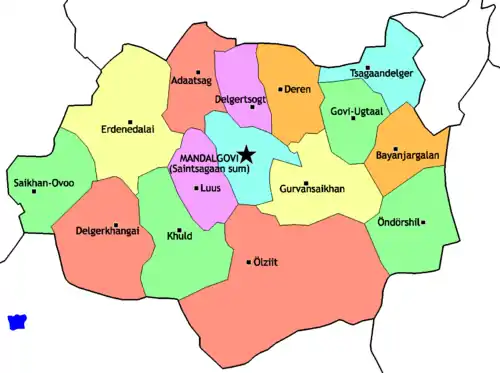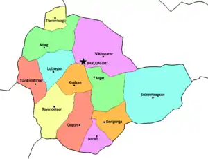 Un sum désigne à la fois le district et la ville (ou village) chef-lieu de ce district. Les Mongols ne font pas la différence, le village étant en général appelé le centre du sum[1].