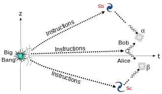 - A. Zeilinger, Dance of the Photons, Farrar, Straus and Giroux, New York, 2010, p. 266. Abner Shimony (en), Michael Horne et John Clauser ont fait un commentaire similaire en réponse à John Bell dans leurs discussions dans les Epistemological Letters (en) : « Dans toute expérience scientifique dans laquelle deux ou plusieurs variables sont censées être choisies au hasard, on peut toujours supposer que certains facteurs dans le recouvrement de l'arrière des cônes de lumière a contrôlé des choix vraisemblablement aléatoires. Mais, nous maintenons, le scepticisme de ce genre rejettera essentiellement tous les résultats d'expérimentations scientifiques. À moins que nous procédions avec l'hypothèse que des complots cachés de ce genre ne se produisent pas, nous abandonnons à l'avance l'ensemble de l'entreprise de découvrir les lois de la nature par l'expérimentation ». (Shimony A, Horne M A and Clauser J F, Comment on the theory of local beables, Epistemological Letters, 13 1 (1976), cité par Jan-Åke Larsson dans Loopholes in Bell inequality tests of local realism, J. Phys. A: Math. Theor. 47 (2014))