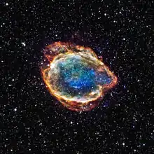 Une supernova de type Ia est une sous-catégorie dans la classification de Minkowski-Zwicky, due aux astronomes Rudolph Minkowski et Fritz Zwicky[9]. De telles supernovae peuvent se former de différentes manières mais partagent un mécanisme commun. Le fait qu'elles dérivent de naines blanches a été confirmé par l'observation de l'une d'elles en 2014 dans la galaxie Messier 82[10]. Une naine blanche à faible vitesse de rotation peut accréter de la matière à partir d'un compagnon et dépasser la limite de Chandrasekhar d'environ 1,4 M☉ (masse solaire), de sorte qu'elle ne peut plus soutenir son poids par la pression de dégénérescence électronique (en)[11]. En l'absence de processus susceptible d'équilibrer l'effondrement gravitationnel, la naine blanche formerait une étoile à neutrons[12], comme dans le cas de naines blanches composées essentiellement d'oxygène, néon et magnésium.