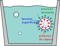 La tension superficielle fait se comporter les bulles de vapeur comme des ballons de baudruche (et plus précisément comme des ballons sous-gonflés de sorte que le caoutchouc soit encore élastique) : la pression à l'intérieur des ballons est légèrement supérieure à la pression ambiante du fait des parois élastiques qui se rétractent. La température doit être légèrement supérieure au point d'ébullition afin de générer assez de pression de vapeur pour compenser la pression ambiante et la tension superficielle et ainsi permettre aux bulles de s'expanser.