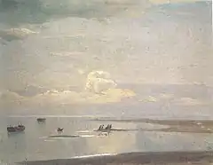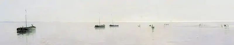 De petits détails viennent compléter le tableau : les figures des pêcheurs sur une étroite bande de sable à droite de la toile, les silhouettes des barques à fond plat et des canots de pêcheurs, figées à la surface de l'eau, et encore quelques canards et des mouettes[2],[7],[13]. Les contours sombres des barques à fond plat « sont subtilement utilisées par le peintre pour souligner la dimension des plans spatiaux »[7]. La dimension relativement petite des barques et des pêcheurs souligne non seulement l'immensité de l'espace qui les entoure, mais montre également le lien entre le fleuve et la vie des gens qui vivent et travaillent sur ses rives[42].