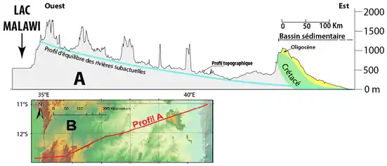 Les surfaces d'aplanissement reflètent généralement les variations de niveau de base. Le profil topographique ci-dessous montre l'érosion des reliefs créés en bordure du Lac Malawi. Les reliefs disparaissent avec l'érosion pour se confondre avec le profil d'équilibre des rivières dont l’altitude et la pente diminuent progressivement. Si de nouveaux reliefs n'apparaissent pas et si le niveau marin d'évolue pas, ce profil finit par devenir sub-horizontal et proche du niveau marin. Les reliefs épars qui demeurent alors sont appelés Inselbergs[2].