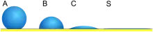 De plus, sur une surface idéale, la goutte reprend sa forme originelle si elle est perturbée[1]. Les dérivations suivantes s'appliquent uniquement aux surfaces solides idéales ; ils ne sont valables que pour l'état dans lequel les interfaces ne bougent pas et la ligne limite de phase existe en équilibre.