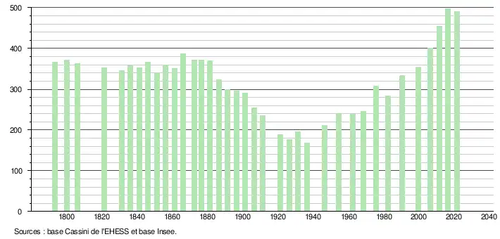 L'évolution du nombre d'habitants est connue à travers les recensements de la population effectués dans la commune depuis 1793. Pour les communes de moins de 10 000 habitants, une enquête de recensement portant sur toute la population est réalisée tous les cinq ans, les populations légales des années intermédiaires étant quant à elles estimées par interpolation ou extrapolation[18]. Pour la commune, le premier recensement exhaustif entrant dans le cadre du nouveau dispositif a été réalisé en 2006[19].