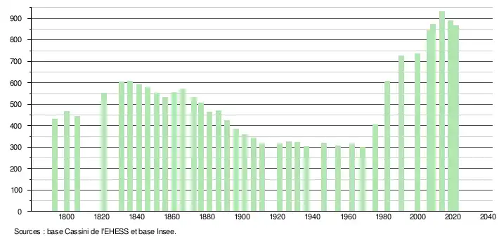 L'évolution du nombre d'habitants est connue à travers les recensements de la population effectués dans la commune depuis 1793. Pour les communes de moins de 10 000 habitants, une enquête de recensement portant sur toute la population est réalisée tous les cinq ans, les populations légales des années intermédiaires étant quant à elles estimées par interpolation ou extrapolation[18]. Pour la commune, le premier recensement exhaustif entrant dans le cadre du nouveau dispositif a été réalisé en 2008[19].