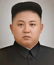 Kim Jong-un, le petit-fils du fondateur de la Corée du Nord, est largement absent du service public et gouvernemental jusqu'au milieu des années 2000. En 2010, il commence à être qualifié de « Jeune général » et à la fin de 2011 de « Général respecteux »[77]. Comme son père, il n'a pas de formation ou de service militaire officiel. [réf. nécessaire] Avec la mort de son père, les médias d'État commencent à se référer à lui comme le « Grand successeur[78] ». Bien qu'il soit encore un jeune dirigeant, le développement de son propre culte de la personnalité est bien avancé, avec un grand nombre d'affiches, de panneaux et d'autres éléments de propagandes répartis dans tout le pays[79],[80]. Certains commentateurs notent sa ressemblance frappante à Kim Il-sung, ce qui l'a aidé à consolider sa position de dirigeant incontesté dans l'esprit des gens[77].