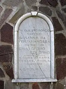 L'inscription en italien se traduit ainsi : Susanna da Fontanarossa, mère de Christophe Colomb, est née dans ce village.