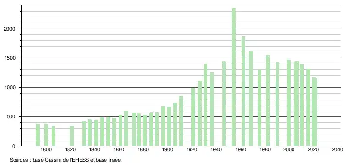 L'évolution du nombre d'habitants est connue à travers les recensements de la population effectués dans la commune depuis 1793. Pour les communes de moins de 10 000 habitants, une enquête de recensement portant sur toute la population est réalisée tous les cinq ans, les populations légales des années intermédiaires étant quant à elles estimées par interpolation ou extrapolation[25]. Pour la commune, le premier recensement exhaustif entrant dans le cadre du nouveau dispositif a été réalisé en 2005[26].