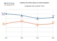Le marché des plus de 125 cm3 répond favorablement à l'entrée de ce modèle. Il devance ses concurrentes sur les ventes, seul Kawasaki demeure intouchable en France. À la suite de l'effondrement du marché moto en 2013 avec un recul de 13,3 %, les ventes du roadster Suzuki accusent une baisse de 18,4 % par rapport à 2012. On note au premier semestre 2014 une amélioration des ventes comparativement à 2013 sur l'ensemble du marché. Le GSR 750 en profite pour afficher +20 % sur cette période[4], il devra faire face à une nouvelle référence chez Yamaha : la MT-09.