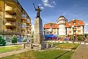 En haut, la place Marie de Resava. Au centre, le lycée public, le musée national d'Histoire naturelle. En bas, la statue de Stevan Sinđelić, la statue d'un Tyrannosaure au musée d'Histoire naturelle. | |