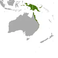 On la trouve dans les forêts ombrophiles tropicales et littorales de la Nouvelle-Galles du Sud de 0 à 3 000 m au-dessus du niveau de la mer[4].