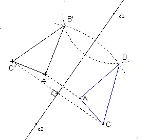 Un triangle (ABC) et son image (A'B'C') par la symétrie d'axe (c1c2). Le point B' est construit au compas seul tandis que C' est construit avec l'équerre.