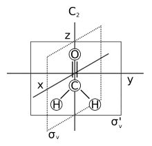 La molécule de formaldéhyde HCHO possède deux plans miroirs dits verticaux (symbole v) parce qu'ils contiennent l'axe de rotation C2 de la molécule. Le plan désigné σv passe entre les deux atomes d'hydrogène, et la réflexion dans ce plan échange les deux atomes d'hydrogène l'un pour l'autre. Le plan désigné σv’ contient les deux atomes d'hydrogène, qui ne sont pas alors déplacés par la réflexion dans ce plan. Si une molécule contient plus d'un axe de rotation, un plan dit vertical contient l'axe principal.