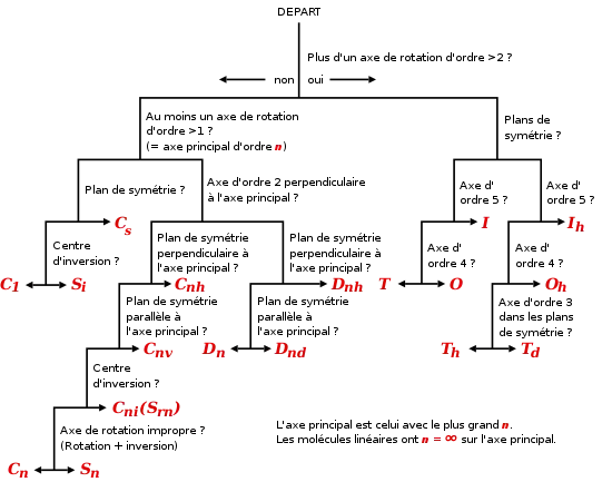 L'organigramme ci-contre permet d'identifier le groupe ponctuel de symétrie de la grande majorité de molécules. Ce système de classement aide les scientifiques à étudier les molécules de façon plus efficace, parce que les molécules de nature chimique semblable et de même groupe de symétrie ont généralement des liaisons et des propriétés spectroscopiques semblables[3].