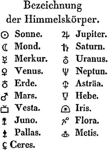 Les deux astéroïdes suivants, Astrée et Hébé, sont découverts par Karl Ludwig Hencke. Il demande que le symbole pour Astrée soit une ancre renversée[43] ; une paire de balances est parfois utilisée à la place[11],[44]. Gauss nomme Hébé à la demande d'Hencke et choisit un verre de vin comme symbole[45],[46].