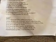 Et en l'Esprit Saint, Seigneur, qui donne la vie, qui procède du Père, qui est adoré et glorifié avec le Père et le Fils, qui a parlé par les prophètes. En l'Église, une, sainte, catholique et apostolique. Je confesse un seul baptême en rémission des péchés. J'attends la résurrection des morts, et la vie du siècle à venir. Amen[13]. »