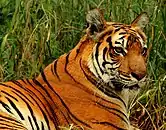Le tigre possède un épais manteau de fourrure jaune avec des rayures foncées. En raison de la combinaison de sa grâce, de sa force, de son agilité et de son énorme puissance, le tigre a été considéré comme l'animal national de l'Inde. Sur les huit races connues de l'espèce, la race indienne, le tigre royal du Bengale, est présente dans tout le pays, à l'exception de la région nord-ouest, ainsi que dans les pays voisins, le Népal, le Bhoutan et le Bangladesh. Pour enrayer la diminution de la population de tigres en Inde, le "Projet Tigre" a été lancé en avril 1973. Jusqu'à présent, 27 réserves de tigres ont été établies dans le pays dans le cadre de ce projet, couvrant une superficie de 37 761 km²[4].