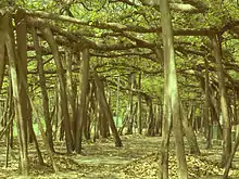 Le figuier indien, Ficus bengalensis, dont les branches s'enracinent comme de nouveaux arbres sur une grande surface. Les racines donnent ensuite naissance à d'autres troncs et branches. En raison de cette caractéristique et de sa longévité, cet arbre est considéré comme immortel et fait partie intégrante des mythes et légendes de l'Inde. Aujourd'hui encore, le banian de l'Inde est le point central de la vie du village et le conseil du village se réunit à l'ombre de cet arbre[7].
