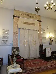 La salle de prière est rectangulaire de dimension approximativement neuf mètres sur douze. L'Arche Sainte se trouve sur le mur est, de façon que les fidèles soient orientés vers Jérusalem lors de la prière. On accède à l'Arche Sainte par trois marches conduisant à une estrade entourée de deux côtés d'une balustrade en bois. L'Arche est encadrée de deux pilastres de section rectangulaire en marbre rose, sur une haute base en marbre gris, et surmontés d'un léger chapiteau de même couleur. Le linteau porte l'inscription en hébreu tiré du Livre des Proverbes :