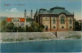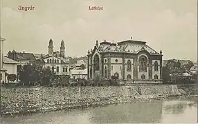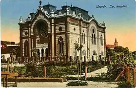 Les architectes sont Gyula Papp et Ferenc Szabolcs, ils imaginent un bâtiment éclatant de style néo-byzantin avec des éléments néo-mauresques. Il s'agit du premier bâtiment en béton de la ville. Au cours de la Seconde Guerre mondiale, le bâtiment est très endommagé, les troupes allemandes et hongroises utilisent le bâtiment comme écuries. En 1947, l'édifice est transformé en salle de concert car apprécié pour ses qualités acoustiques. Les autorités soviétiques décident de cette reconversion malgré l'opposition des juifs rescapés de la Shoah de retour dans la ville. L'orchestre symphonique régional y est localisé.