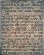 Ici se trouvait la synagogue de la communauté juive qui a été détruite dans la nuit du »