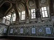Le plafond est formé d'une voûte en plein cintre, décorée de stucs dorés et de motifs floraux qui se détachent sur un fond bleu-vert. Sur ce fond, se distingue une phrase en hébreu en grandes lettres d'or: « זה שער השמים » (translittération: « z Shaar a shamaiym ») qui signifie « C'est ici la porte des cieux ». Plusieurs grands lustres en cuivre pendent du plafond.