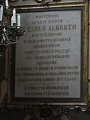 Deux plaques similaires, l'une en hébreu et l'autre, la seule plaque en italien de toute la synagogue, concernent l’émancipation des Juifs du Piémont en 1848[4].