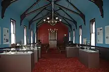 Au fond de la pièce se trouve un estrade avec un pupitre, et adossé au mur l'arche sainte dans laquelle sont conservés les rouleaux de Torah. Une galerie à l'arrière du bâtiment permet d'accueillir un chœur. Avant d'accéder à la salle de prière, on passe par un petit vestibule de 2,2 m de long.