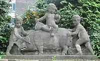 Deux ans plus tard, un clocheton commun relie la nouvelle Sparkasse (caisse d'épargne) municipale à la synagogue terminée. Cependant les fidèles de la synagogue sont profondément choqués par un haut-relief situé juste au-dessus du portail d'entrée de la Sparkasse. Ce haut-relief, sculpté par Uffert Jansen, représente un cochon porte-bonheur entouré de trois putti. L'arrière du cochon est orienté vers la synagogue. Après de longs débats au conseil municipal, la sculpture est retirée et placée dans le bureau du génie civil de l'époque. Depuis 2001, elle est située sur la Sparkasse à l'intersection de l'Aktienstrasse et de l'Engelbertusstrasse.