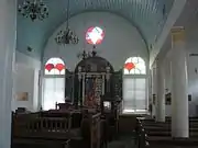 La salle de prière est entièrement peinte en blanc, à l'exception du plafond en bois de forme demi-cylindrique du vaisseau central. De chaque côté un collatéral séparé du vaisseau central par trois colonnes cylindriques sur la majorité de leur longueur, mais s'effilant vers le haut.