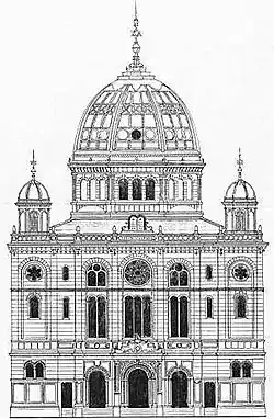 La synagogue se présente sous la forme d'un bâtiment cubique de deux étages, avec sur le côté est une abside semi-circulaire. Les quatre façades du bâtiment sont divisées symétriquement par des hautes fenêtres et sont ornées de nombreux éléments décoratifs, héritage de l'architecture de la Renaissance. Les façades sont terminées par un toit en légère pente couronné par un important dôme central, et par des petits dômes placés aux quatre coins du bâtiment. Le bâtiment est monumental, faisant 41 mètres en longueur, 25 mètres en largeur et 42 mètres de hauteur jusqu'au sommet du dôme. Ses dimensions sont accentuées par la situation de la synagogue au sommet du Judenberg. La synagogue domine le panorama de la ville et est visible de toute la région alentour.