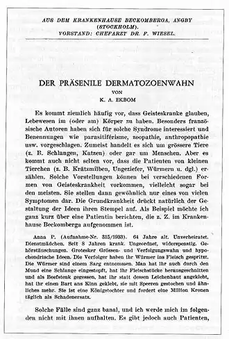 En 1938, le neurologue suédois Karl Axel Ekbom (1907-1977) décrit, à partir de 7[5] ou 22 cas[6], une nouvelle entité sous le terme de « délire dermatozoïque », que les auteurs suivants appellent syndrome d'Ekbom. D'autres auteurs parlent d'« obsessions hallucinatoires zoopathiques », comme Henri Ey (1900-1977), ou de « délires cénesthésiques »[4].