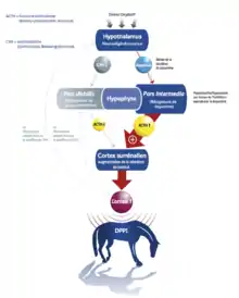 Les cellules corticotropes de la pars distalis produisent de l’ACTH en réponse à la stimulation pulsatile de la corticolibérine (CRH) et de l’arginine vasopressine (ADH) produites par l’hypothalamus[4]. L’ACTH ainsi libérée agit sur la zone fasciculée du cortex surrénalien, stimulant la production et la sécrétion de cortisol. Un rétrocontrôle négatif sur la sécrétion d’ACTH s’exerce dans l’hypothalamus et la pars distalis en réponse à des taux plasmatiques normaux ou élevés de cortisol[20]. le DPIP est caractérisé par la surproduction par la pars intermedia de l’hypohyse de 4 hormones α-MSH, β-endorphine, CLIP, ACTH. La production en excès de ces hormones est causée par un déficit de dopamine du fait de la dégénérescence des neurones dopaminergiques qui la produisent au niveau de l’hypothalamus, la dopamine exerçant un rôle régulateur sur la pars intermedia de l’hypophyse.