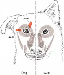 L’article « Evolution of facial muscle anatomy in dogs » par Kaminski, Waller, Diogo, Hartstone-Rose et Burrows publié en 2019[29], démontre d’ailleurs que l’anatomie faciale des chiens aurait été façonnée par la domestication principalement pour faciliter la communication avec les humains. La méthode utilisée pour la réalisation de l'étude a été séparée en deux catégories, soient en données anatomiques et en données comportementales. En ce qui concerne les données anatomiques, 4 loups sauvages (Canis lupus) et 6 chiens domestiques (Canis familiaris) ont été utilisés pour faire une dissection faciale comparative. Les résultats ont démontré que les principales distinctions anatomiques faciales entre les chiens domestiques et les loups sauvages se trouvent au niveau de la musculature entourant l'œil, soit la présence chez les chiens et l’absence chez les loups du levator anguli oculi medialis (LAOM), un muscle permettant de hausser le coin intérieur des sourcils indépendamment du plissement de relaxation des yeux. En effet, chez les loups, ce muscle n’est pas complètement formé et est plutôt simplement représenté par un tendon ou un amas de fibres situé au même endroit que le LAOM chez les chiens. L’autre différence est la présence et le niveau de développement du retractor anguli oculi lateralis (RAOL), un muscle qui permet de tirer latéralement le coin de la paupière vers les oreilles. Ce muscle, quoique présent chez plusieurs loups, est beaucoup plus mince et fragile que chez les chiens. D’autre part, bien qu’il soit présent chez tous les chiens domestiques, il est toutefois exceptionnellement absent chez le husky de Sibérie, une race de chien dont la domestication s’est faite plus tardivement et qui se rapproche donc davantage des loups. Au niveau des données comportementales, 9 loups et 27 chiens ont été individuellement filmés pendant 2 minutes chacun par un étranger se tenant face à eux à une distance d'environ 2 à 5 m afin de quantifier la fréquence et l'intensité d'un mouvement facial spécifique autour de l'œil permis par le LAOM, soit le relèvement intérieur du sourcil appelé AU101. Il a été démontré que ce mouvement est réalisé plus fréquemment et à une intensité plus élevée chez les chiens domestiques que chez les loups. Un mouvement similaire aurait pu être exprimé chez un ancêtre du chien domestique et aurait été, de manière consciente ou non, préféré et donc sélectionné au cours des 33 000 années séparant les chiens des loups et menant ainsi au développement de muscles distincts entre ces deux espèces. Une première hypothèse expliquant cette préférence est que l’exposition de la sclérotique blanche des yeux du chien par un mouvement AU101 exagéré est attrayant pour les humains parce qu’il aide à donner une direction au regard et que cela représenterait une adaptation pour la communication sociale et les interactions coopératives. Une seconde et plus probable hypothèse serait que le mouvement AU101 ressemble à l’expression faciale produite par les humains quand ils sont tristes et entraîne l’expression de caractéristiques pédomorphiques telles que des yeux plus gros donnant une apparence plus juvénile engendrant ainsi une réponse de soins et présentant un avantage sélectif. En effet, le regard mutuel et les caractéristiques énumérées ci-dessus entrainent une libération d’ocytocine qui occupe un rôle primordial dans l’affiliation, l’attachement et l’expression du comportement maternel. Les résultats obtenus confirment donc que la domestication aurait permis l’expression de mouvements et le développement de certains muscles chez les chiens domestiques en comparaison aux loups sauvages par des pressions de sélection visant à faciliter la communication.