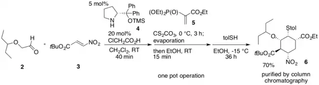 Dans la première synthèse one-pot, l'équipe de Hayashi Yujiro commence par utiliser le diphénylprolinol silyl éther (4)[13] comme catalyseur organique pour effectuer une addition de Michael asymétrique de l'alcoxyaldéhyde (2) et du nitroalcène (3) et donnant l'adduit de Michael de bonne énantiomérie. Lors de l'addition d'un dérivé de phosphate de diéthyle et de vinyle (5) à l'adduit de Michael, une réaction de Michael en domino et une réaction de Horner-Wadsworth-Emmons se produisent en raison du dérivé avec le groupe phosphonate issu de 5. Pour transformer des sous-produits indésirables en le dérivé cyclohexéncarboxylate d'éthyle désiré, le mélange du produit et des sous-produits est traité avec du carbonate de césium, Cs2CO3 dans de l'éthanol. Cela provoque une rétro-réaction Michael sur un des sous-produits et une rétro-réaction aldol accompagnée d'une réaction de Horner-Wadsworth-Emmons sur un autre. Les deux sous-produits sont ainsi convertis avec succès en le dérivé souhaité. Finalement, l'addition de p-toluènethiol en présence du Cs2CO3 donne 6 avec un rendement de 70% après avoir été purifié par chromatographie sur colonne, avec un bon excès énantiomérique pour le stéréoisomère souhaité[11].