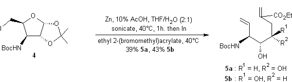 4 subit une réaction en deux étapes, dérivée de Bernet-Vasella qui, elle, fournit un mélange de 5a et 5b équimolaire. Le zinc activé permet la fragmentation réductrice de 4, la poudre d'indium promeut le couplage entre l'aldéhyde intermédiaire et le bromoacrylate d'éthyle et finalement un mélange 3:1 en faveur du bon stéréoisomère est obtenu avec un rendement global de 82%. 5a et 5b sont séparés par chromatographie flash sur colonne.