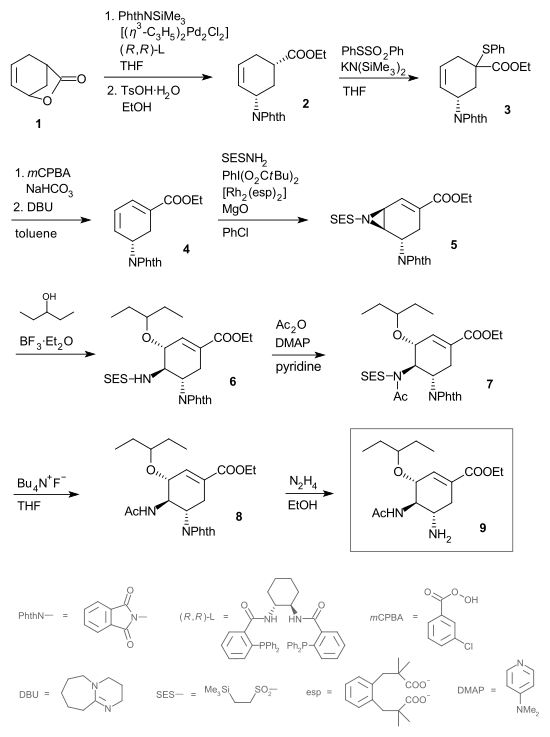 En 2008, le groupe de Barry M. Trost de l'Université Stanford publie la plus courte voie de synthèse de l' oseltamivir de bonne stéréoisomérie (9) à ce jour[10].