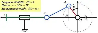 On considère ici que le système bielle-manivelle est dans la configuration où la liaison de l'extrémité de la bielle est une liaison glissière (cas des moteurs et pompes) ; que le mécanisme est un mécanisme plan et que l'axe du piston croise l'axe de la manivelle (axes concourant). La géométrie, suivant le schéma ci-contre, est décrite par :