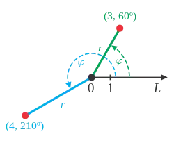 Les coordonnées polaires sont définies dans le plan hyperbolique de la même manière que les coordonnées polaires usuelles : un point de référence O (appelé le pôle) et une demi-droite Ox issue de ce point (appelé l'axe polaire) définissent un repère polaire ; chaque point P est repéré par sa distance au pôle (appelée coordonnée radiale ou rayon) et par l'angle (appelé coordonnée angulaire ou angle polaire).
