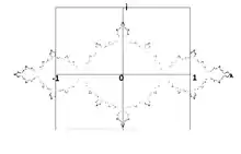 - Le cas f(z) = z2 – 1 fournit l'ensemble de Julia associé, noté[16] J–1. On peut prendre pour X le carré de centre 0 et de côté 4.