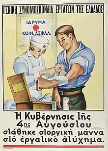 Ioánnis Metaxás accorde une attention toute particulière au développement de l'I. K. A. Les grèves ouvrières de 1936 convainc ce dernier d'étendre le champ de protection initial[7]. Le temps de travail quotidien est abaissé à 8 heures, le dimanche est obligatoirement chômé, les accidents du travail pris en charge sont élargis, les chômeurs reçoivent une aide alimentaire régulière. Des livrets de santé individuels pour les travailleurs sont mis en place. Des cliniques sont construites pour assurer gratuitement les services de maternité et lutter ainsi de manière plus efficace contre les conditions parfois très précaires d'accouchement. Les naissances sont contrôlées par l'État. Les inspections du travail et la médecine du travail veillent au respect des mesures ainsi qu'à la surveillance de la santé des travailleurs. Les congés payés sont institués, les travailleurs disposant de deux semaines de vacances. L'interdiction du travail des mineurs est affirmé et des mesures de répression sont mises en place contre les entreprises ne respectant pas la loi. Pour éradiquer le paludisme, des nouvelles cliniques sont construites à travers tous le pays et ont permis l'hospitalisation de quelque 7 124 enfants. Les cantines scolaires sont imposées en 1937 afin de veiller à l'organisation alimentaire publique. Des repas aux chômeurs sont distribués dans près de quarante-huit villes du pays. En 1938, conscient de la faible quantité du personnel soignant, une école d'Infirmières est créée non loin du Zappéion, au cœur de la cité athénienne.