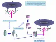 Lorsque deux têtes globulaires ou plus de C1 se lient à un ligand (pathogène ou anticorps), C1 active C1r, qui devient protéolytique, et clive C1s pour désamorcer la cascade de protéolyse[6]. Chaque clivage libère un petit fragment : C4a, C2a et C3a qui agissent sur les cellules inflammatoires.