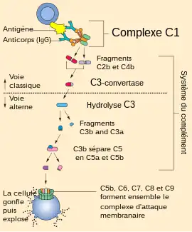 Le C3b, qui est le plus grand fragment de la lyse de C3 par la C3-convertase, se lie de façon covalente à la surface de la cellule. Le plus petit fragment, C3a, agit quant à lui comme signal diffusible qui provoque une réponse inflammatoire, en stimulant la migration des globules blancs vers le site de l'infection. Le fragment C3b fixé à la membrane, produit à la fois par la voie classique et la voie alterne, et même la voie des lectines, amorce la cascade des réactions qui conduit à la formation du complexe d'attaque membranaire, à partir des composants tardifs du complément. Il est donc fixé sur la membrane de façon covalente, et il clive le facteur C5 en C5a et C5b. C5b reste faiblement lié à C3b et s'assemble rapidement à C6 et C7 pour former le complexe C5b67 qui va s'ancrer à la membrane via C7. Ce complexe lie ensuite C8, pour former le complexe C5b678. La liaison du facteur C9, qui expose une région hydrophobe après changement de conformation, entraîne son insertion dans la membrane plasmique de la cellule. Il s'ensuit alors une réaction en chaîne où les C9 de nouvelle conformation vont lier des C9 de l'ancienne, entraînant le changement conformationnel qui leur permet de s'insérer dans la double couche lipidique. C'est ainsi qu'il se forme un canal au travers de la membrane cellulaire (Complexe d'attaque membranaire (CAM)). Dès lors, la perméabilité de la cellule est perturbée, les petites molécules pénètrent et sortent de la cellule au voisinage de ces pores, et à travers ceux-ci. Les macromolécules ne peuvent cependant pas passer. De ce fait, le mécanisme cellulaire contrôlant l'équilibre des échanges est bouleversé. L'eau entre par osmose dans la cellule, faisant augmenter son volume jusqu'à la lyse. On observe ce même phénomène de lyse avec des globules rouges en solution hypotonique. Ce système est très efficace puisqu'il a été observé que la présence d'un seul de ces canaux permet la lyse d'un globule rouge.
