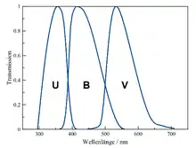 Les filtres sont choisis de façon que les longueurs d'onde moyennes des bandes spectrales soient de 364 nm pour U, 442 nm pour B et 540 nm pour V. Le point zéro des indices de couleur B-V et U-B a été défini pour être nul pour les étoiles de type A0 V non affectées par le rougissement interstellaire. Véga est l'une des étoiles qui a servi d'étalon primaire pour étalonner ce système de filtre[2].