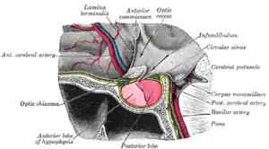 Plusieurs veines portes hypophysaires (venae portales hypophysiales) partent du réseau capillaire de l'hypothalamus, situé au niveau de l'éminence médiane, et relié à l'artère hypophysaire supérieure. Elles constituent le rete mirabile (du latin rete, « réseau », et mirabile, « merveilleux »), placé sur toute la longueur de l'infundibulum. Elles alimentent le réseau capillaire de l'adénohypophyse. C'est un des rares systèmes porte dans l'organisme, c'est-à-dire qui mette en jeu deux réseaux capillaires connectés en série par des veinules. L'antéhypophyse n'est irriguée que par le système porte[1].