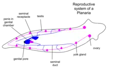 Toutes les planaires sont hermaphrodites : leur système reproducteur comporte donc une partie mâle et une partie femelle. Les deux parties communiquent avec la surface du corps par une seule ouverture appelée gonopore, qui est située sur la face ventrale de la moitié postérieure du corps.
