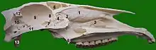 - Sinus maxillaire dans le maxillaire supérieur, au-dessus de la racine des dents. Chacun est divisé en deux composantes, le sinus maxillaire rostral à l'avant et le sinus maxillaire caudal à l'arrière. Ils ne communiquent pas. En outre, chacun de ces sinus est subdivisé en une composante médiane (interne) et latérale (externe), par une paroi osseuse incomplète qui porte le canal sous-orbitaire contenant des nerfs et des vaisseaux sanguins. La proximité de la racine des dents signifie que lorsque les dents poussent avec l'âge, les sinus maxillaires deviennent plus grands.