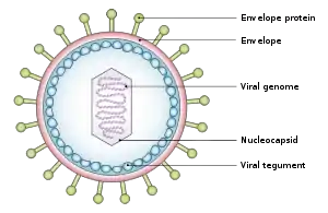 Un tégument, plus communément appelé protéine de matrice, est un groupe de protéines qui tapisse l'espace entre l'enveloppe virale et la capside de tous les Herpesvirales. Le tégument contient des protéines qui facilitent la réplication virale et l'évasion de la réponse immunitaire, avec l'inhibition de la signalisation dans le système immunitaire et l'activation des interférons. Le tégument est libéré dans le cytoplasme peu de temps après l'infection. Ces protéines sont généralement formées au cours de la phase tardive du cycle infectieux, après la réplication des gènes viraux[1],[2],[3].
