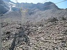 ![]() Le glacier de la Girose, site du troisième tronçon entre le col des Ruillans, lieu de la prise de vue, et le dôme de la Lauze à l'horizon sur la droite. |