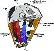- Télescope SIGMA : Le télescope à rayons X SIGMA couvre la gamme d'énergie de 35 à 1 300 keV avec une surface utile de 800 cm2 et un champ de sensibilité maximale de vue de ~ 5 ° x 5 °[8]. Son pouvoir de résolution était de 15 minutes d'arc[9].